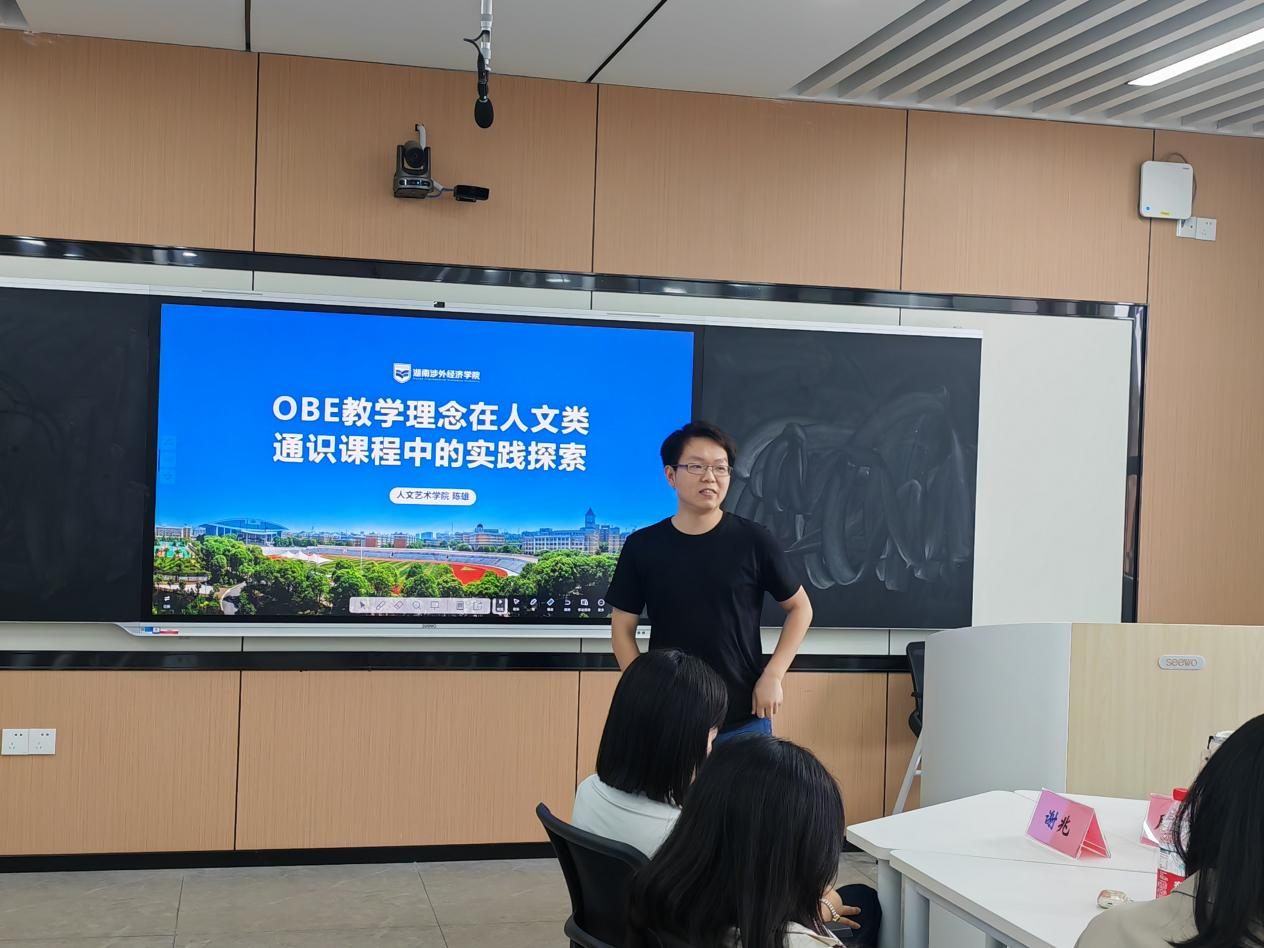 人文艺术学院陈雄老师则以大学语文教学为例,分享了如何使用OBE理念在内容上增加吸引力、与学生的心灵发生碰撞。他分享了“学科交叉”的教学模式,将大学语文与音乐、科技、商业等学科相结合,打破专业隔阂,使语文教学更具实用性和吸引力。陈老师还分享了多个鲜活的教学案例,展示了如何在教学中实现跨学科融合和知识创新。