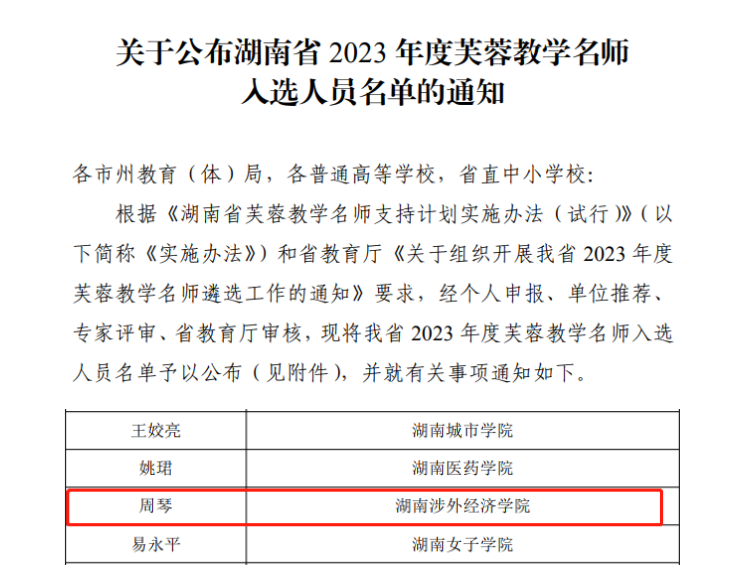 近日,湖南省2023年度芙蓉教学名师入选人员名单公布。我校信息与机电工程学院大学数学教学部周琴老师被评为湖南省芙蓉教学名师。周琴是我校大学数学教学部主任,教授,湖南省普通高校青年骨干教师,湖南省高校“双带头人”标兵,太阳城娱乐师德标兵。第二批国家一流本科课程、湖南省高校线上线下混合式一流本科课程《概率论与数理统计》负责人,湖南省高校线上一流本科课程《线性代数》、《概率论基础》负责人。今年4月...
