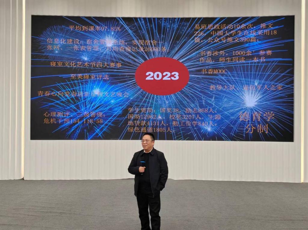 1月4日,我校2023年学工系统总结会议在学术讲堂举行。学校副校长鞠晨曦系统总结了学工部门在2023年取得的成绩,并对2024年的工作提出了新的要求。鞠晨曦副校长以一组一组的数据,盘点学工系统在学风建设、一站式学生社区建设、易班与网络思政、书香校园工程、德育学分制、共青团工作、奖助学、心理健康教育等各方面取得的进步与成绩。他说,学工系统在2023年学校的本科审核评估、文明高校创建中作出了突出的贡献。鞠晨曦副校长...