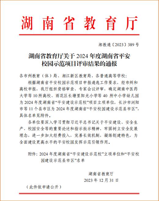 近日,湖南省教育厅发布了《关于2024年度湖南省平安校园示范项目评审结果的通报》,我校获评2024年度湖南省“平安建设示范校”项目立项单位。近年来,学校始终坚持总体国家安全观,深入学习贯彻习近平总书记关于平安建设、安全生产、校园安全等的重要指示精神,紧紧围绕“平安校园”创建工作要求,落实建设责任,完善保障制度,做好风险辨识,加强风险管控,全面排查隐患,开展闭环整治,有力维护了学校发展大局的平安稳定。学...