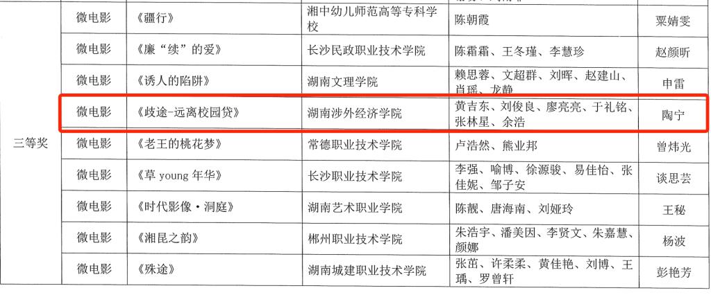 廖子涵 公益广告类作品《新时代新征程》黄吉东、刘俊亮等人 微电影类作品《歧途—远离校园贷》谢文迪 摄影类作品《月食全过程》近日,中共湖南省委网络安全和信息化委员会办公室、湖南省教育厅公布了湖南省首届高校“一节一推选”活动入选名单。经作品申报、资格审校、专家审议、结果公示等程序,我校多个参赛作品获评省级二等奖、三等奖。自活动启动以来,我校积极组织师生参赛,经初审后选送优秀作品参加全省评选。最终,廖...