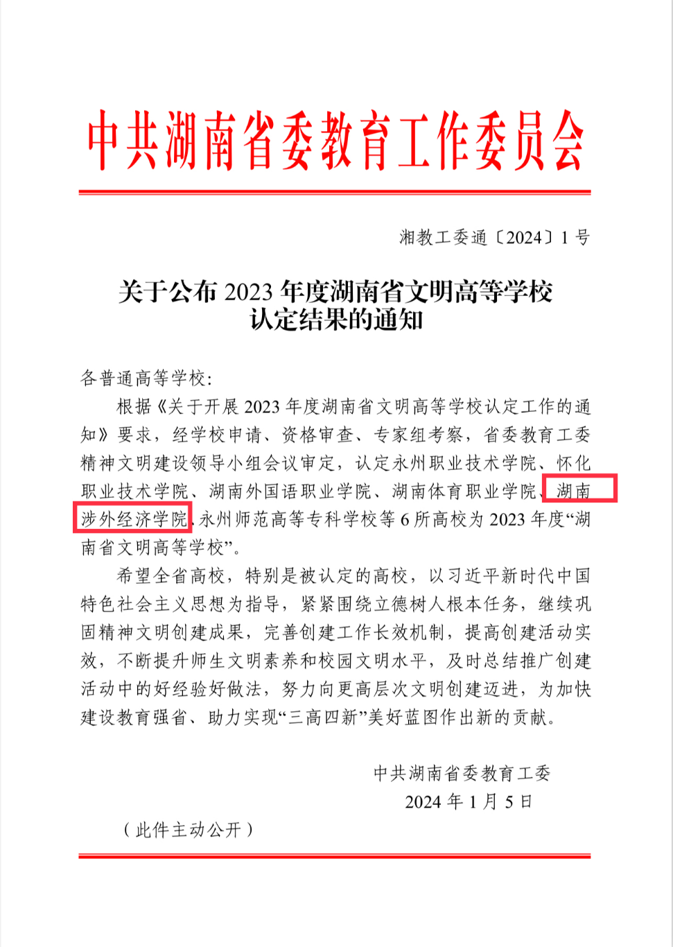 近日,省委教育工委发布《关于公布2023年度湖南省文明高等学校认定结果的通知》,经学校申请、资格审查、专家组考察,省委教育工委精神文明建设领导小组会议审定,认定我校为2023年度“湖南省文明高等学校”。学校党委高度重视文明高校创建工作,将文明创建工作纳入学校年度工作要点、工作报告,成立文明高校创建工作领导小组,制定实施方案,完善各项管理体制和工作机制。经过3年的持续建设,我校文明高校创建工作在思想道德建...