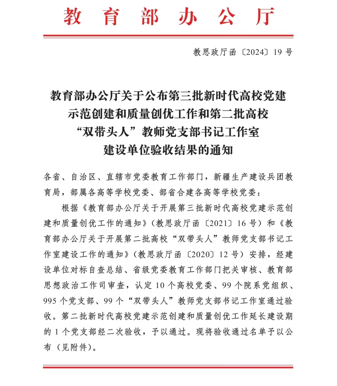 近日,教育部办公厅发布《关于公布第三批新时代高校党建示范创建和质量创优工作和第二批高校“双带头人”教师党支部书记工作室建设单位验收结果的通知》(教思政厅函〔2024〕19号),我校外国语学院(已更名为外国语与国际教育学院)学生第二党支部成功通过第三批“全国党建工作样板支部”验收,标志着我校党建工作取得新突破,对民办高校基层党组织建设起到了示范作用。自2022年3月获批教育部“全国党建工作样板支部培育创建单...