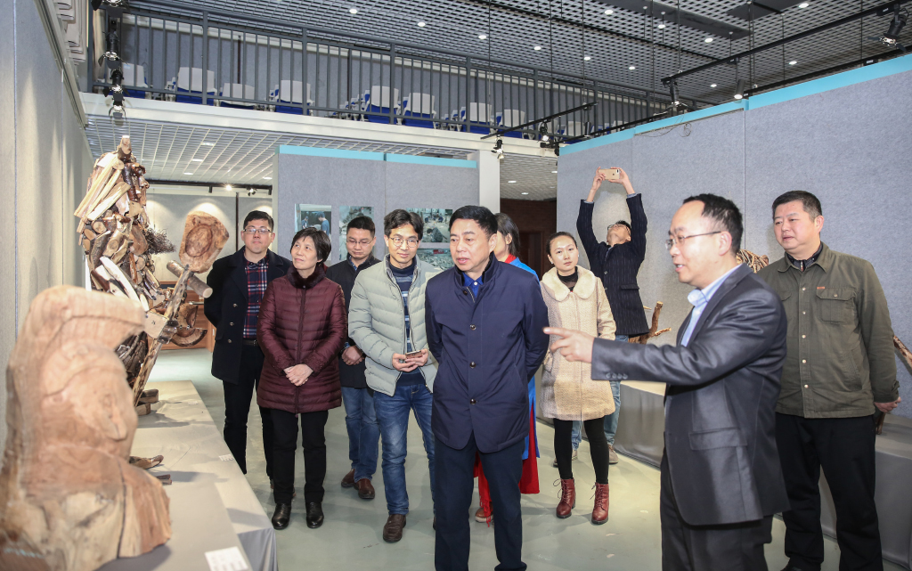 (王耀中校长一行参观原木艺术展)(展出作品)(展出作品)(展出作品)浅灰色调的大厅,弥漫着木质特有的清香,在若干如繁星般顶灯的照映下,一个个活灵活现、创意十足的原木艺术作品迸发着迷人的柔和光芒。有站着的李逵和神农氏,雄姿勃发;有爬在墙上的树蛙和蜘蛛,憨态可掬;有漫步的仙鹤和梅花鹿,灵秀脱凡……这便是我校艺术设计学院杨刚副教授的原木艺术展现场。3月21日上午10点,学校校长王耀中,副校长白解红,副校...